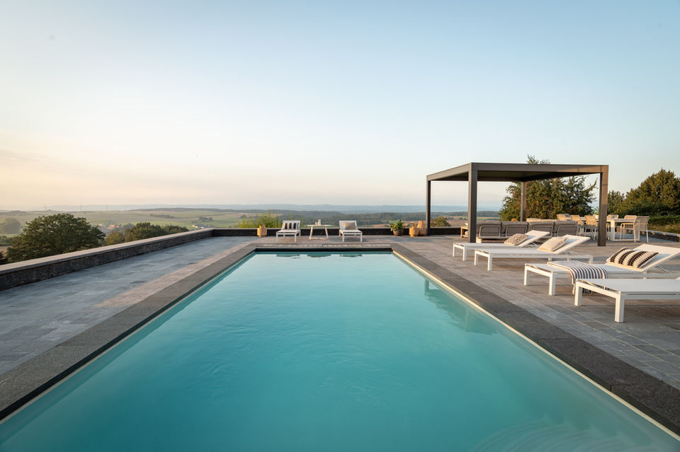 In de tuin en op het terras kan je heerlijk ontspannen in het comfortabele en met zorg uitgekozen meubilair van Verbeke Outdoor. Zowel naast het zwembad als op het gazon geniet je er, in alle privacy, van een schitterend uitzicht op de prachtige streek.